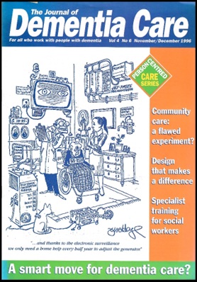 In an article the following year Professor Marshall described new approaches she’d encountered (Marshall, 1996). These included passive infra-red devices to record movement, linked to a computer that “knew” whether this was a normal pattern for the person, or not (she saw these in use in Australia). She described a smart house in Brussels, where almost every aspect of living is programmed or operated by a remote control linked to a computer. The front cover of that issue (above) shows a cartoon with a very cynical view of the future of technology in care.